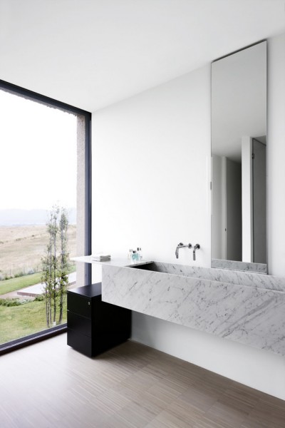 I love the contrast of the countryside with minimalist design...keeps it look fresh. I would love to sit on those couches in the last photo! :)